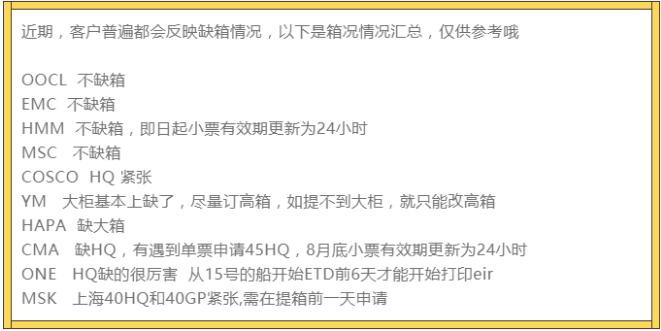 除了運(yùn)費(fèi)上漲之外,最近又出現(xiàn)了新一輪的空箱短缺,這就很難再提柜了!各大船公司已經(jīng)調(diào)整了提柜的措施!以下是案例條件的總結(jié),僅供您參考。