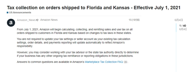 美國站運營成本將要上升,亞馬遜決定7月起正式對售往佛羅里達州和堪薩斯州兩州的訂單征稅!